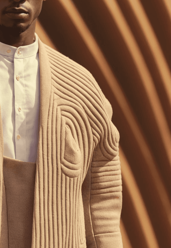 The Topology Textured Jacket draws inspiration from the undulating landscapes of the Sahel. Its surface features ridges and grooves reminiscent of contour lines on a topographic map, translating geography into wearable form. Structured yet soft, the piece maintains its silhouette while reflecting the earthy tones of desert terrain. It embodies the spirit of Synthetic Vernacular, where material and environment converge in design.
