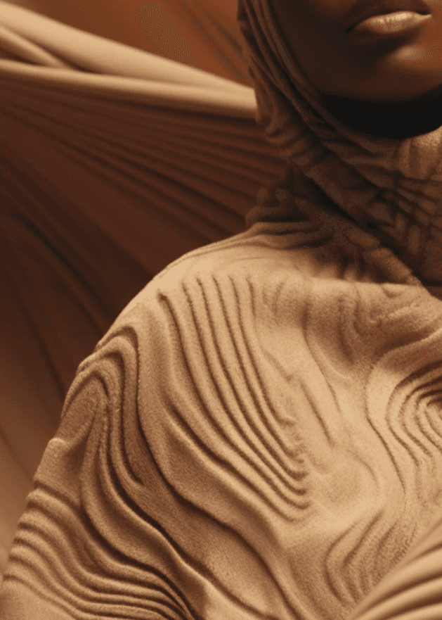 The Topology Textured Hooded Cape reinterprets the contours of the Sahel in a flowing, architectural form. Its surface ripples with ridges that recall the lines of topographic maps, turning geography into texture. Designed to hold its structure while remaining lightweight, the cape embodies movement, protection, and terrain, a wearable landscape shaped by Synthetic Vernacular design.